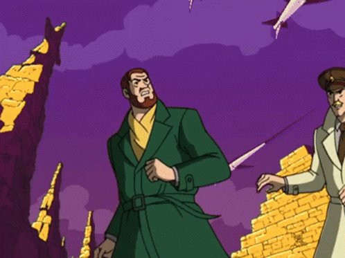 Paglalarawan ng Content: a man in a green coat is standing next to a man in a white suit