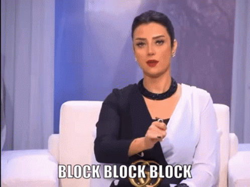 Paglalarawan ng Content: a woman is sitting on a couch and pointing at the camera while saying block block block .
