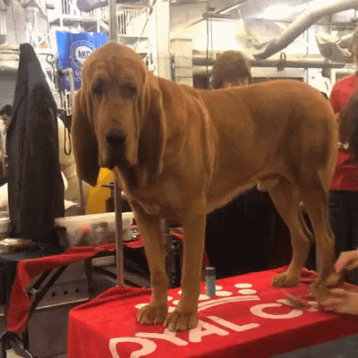 Paglalarawan ng Content: a brown dog standing next to a red table cloth that says dryalc on it