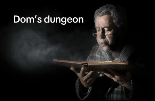 Paglalarawan ng Content: a man holding a book with the words dom 's dungeon behind him