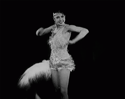 Paglalarawan ng Content: a black and white photo of a woman in a feathered dress dancing in a dark room .