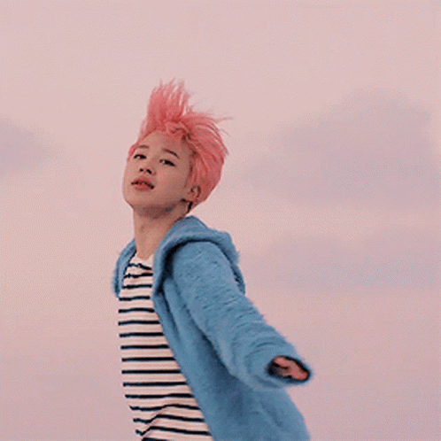 Paglalarawan ng Content: a young man with pink hair is wearing a striped shirt and a blue sweater