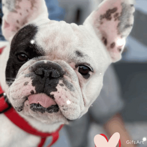 Paglalarawan ng Content: a close up of a french bulldog with a red collar and a heart in the corner