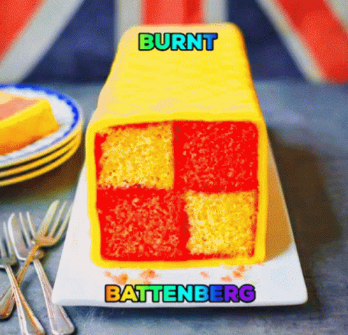 Paglalarawan ng Content: a yellow and red checkered cake with the words burnt battenberg on it