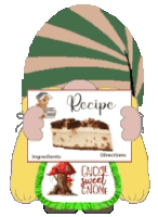 Paglalarawan ng Content: a gnome is holding a recipe card with a picture of a cake on it