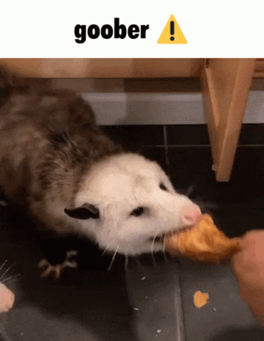 Paglalarawan ng Content: a picture of an opossum eating a piece of food with the words goober above it