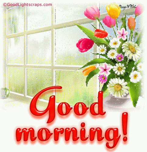Paglalarawan ng Content: a bouquet of flowers in front of a window with the words good morning written in red