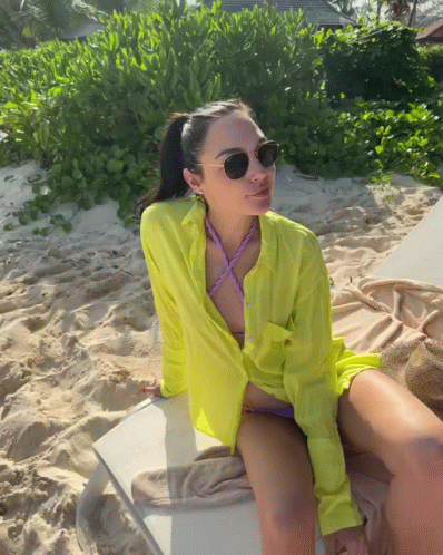 Paglalarawan ng Content: a woman wearing sunglasses and a yellow shirt is sitting on a beach