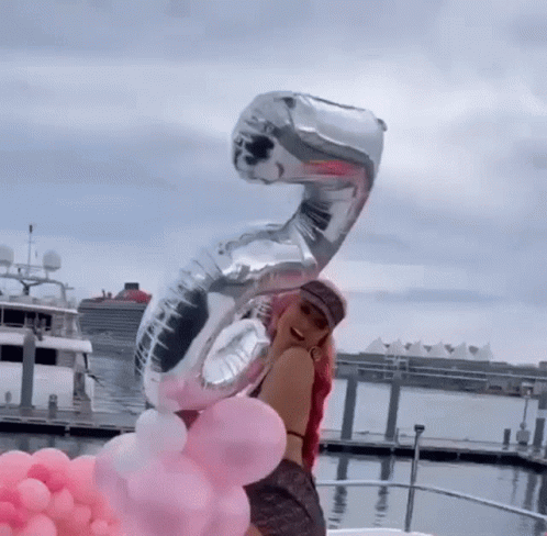 Paglalarawan ng Content: a woman is standing on a boat with balloons and a number balloon .