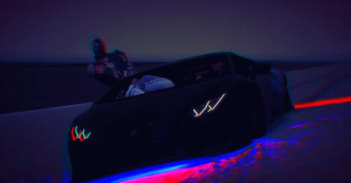 Paglalarawan ng Content: a man in a mask stands next to a car that has the letter v on the front of it