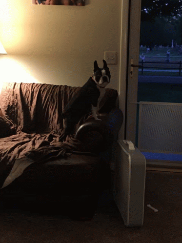 Paglalarawan ng Content: a black and white dog sitting on a brown couch