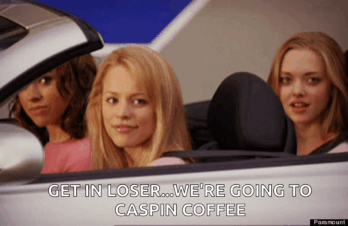 Paglalarawan ng Content: three women are sitting in a car with the words get in loser we 're going to caspin coffee