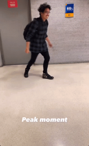 Paglalarawan ng Content: a man walking in a hallway with a sign that says peak moment on the floor
