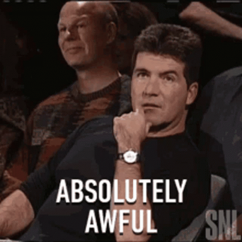 Paglalarawan ng Content: a man sitting in a crowd with the words " absolutely awful " on the screen