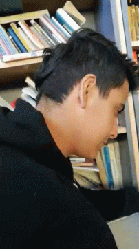 Paglalarawan ng Content: a man is laying on his back in front of a bookshelf filled with books .
