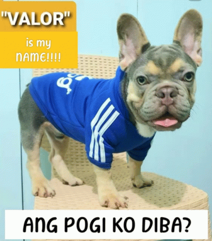 Paglalarawan ng Content: a dog wearing a blue shirt that says " valor " is standing on a chair