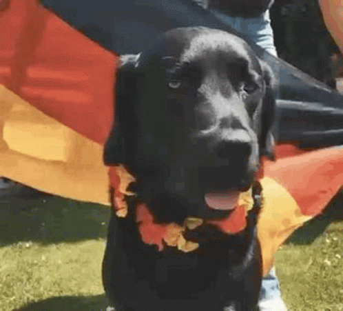 Paglalarawan ng Content: a black dog wearing a lei is sitting in front of a german flag