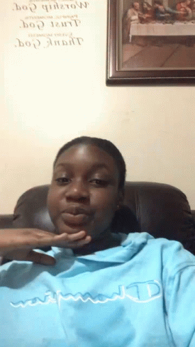 Paglalarawan ng Content: a woman in a blue champion sweatshirt sits in front of a painting