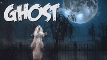 Paglalarawan ng Content: a ghost is standing in front of a full moon in a cemetery with the word ghost above it
