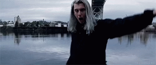 Paglalarawan ng Content: a man with long white hair is standing next to a body of water with his arms outstretched .