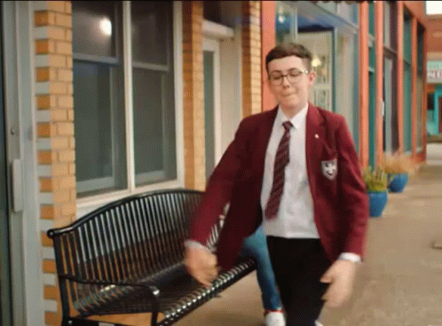Paglalarawan ng Content: a man in a red jacket and tie is standing next to a park bench .