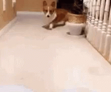 Paglalarawan ng Content: a brown and white corgi dog is walking on a white floor .