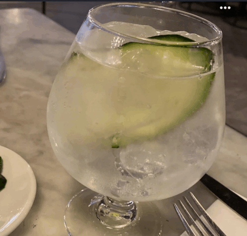 Paglalarawan ng Content: a glass with ice and a cucumber slice in it