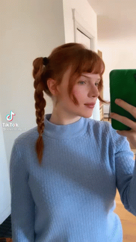 Paglalarawan ng Content: a woman in a blue sweater is taking a selfie with her cell phone .