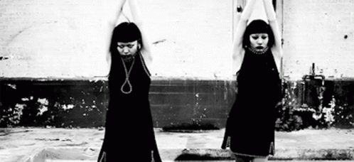 Paglalarawan ng Content: two women in black dresses are standing next to each other with their arms up in front of a white wall .