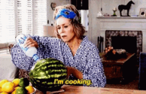 Paglalarawan ng Content: a woman is cutting a watermelon with the words i 'm cooking written on it .
