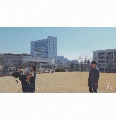 Paglalarawan ng Content: two people standing in a field with a large building in the background