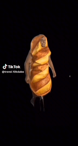 Paglalarawan ng Content: a man is wrapped in a loaf of bread and dancing .