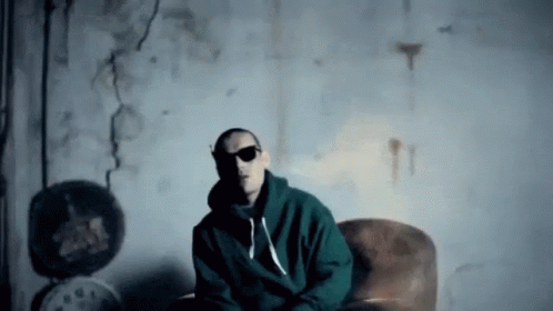 - Paglalarawan ng Content: a man wearing sunglasses and a green hoodie is sitting in a chair in a dark room .