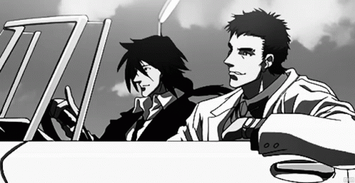Paglalarawan ng Content: a black and white drawing of two men in suits driving a car