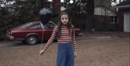 Paglalarawan ng Content: a girl in a striped shirt holds a black balloon in front of a red car
