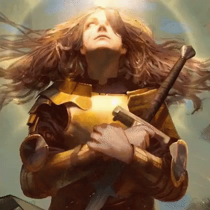 Paglalarawan ng Content: a woman in armor is holding a sword and looking up at the sky .