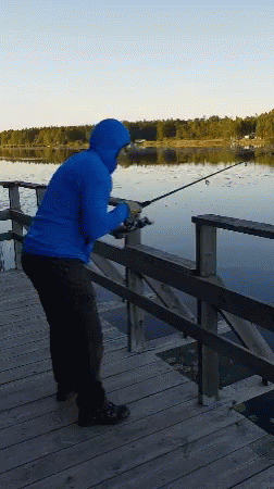 Paglalarawan ng Content: a man in a blue hoodie is fishing on a wooden dock