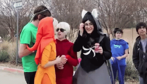 Paglalarawan ng Content: a group of people in costumes are standing in front of a sign that says no parking