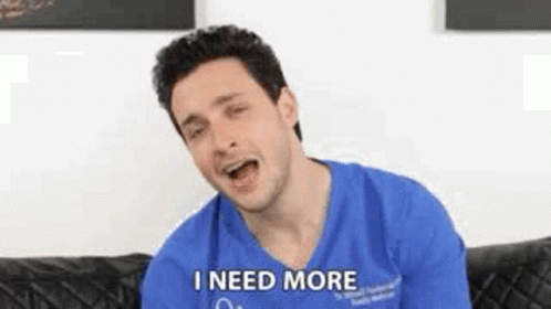 - Paglalarawan ng Content: a man in a blue shirt is sitting on a couch with his mouth open and says `` i need more '' .