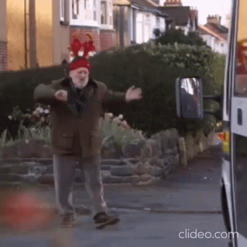 Paglalarawan ng Content: a man wearing a reindeer hat is standing on a street with his arms outstretched