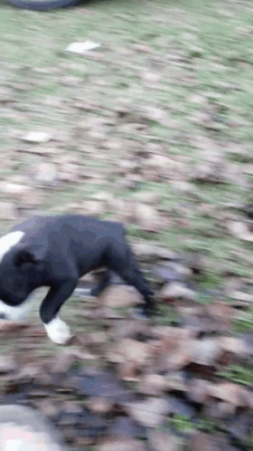 Paglalarawan ng Content: a black and white dog is running through a field of leaves