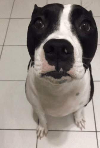 Paglalarawan ng Content: a black and white dog sitting on a tiled floor looking up