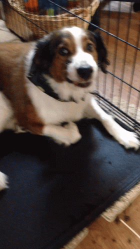 Paglalarawan ng Content: a brown and white dog laying on a black mat in a cage
