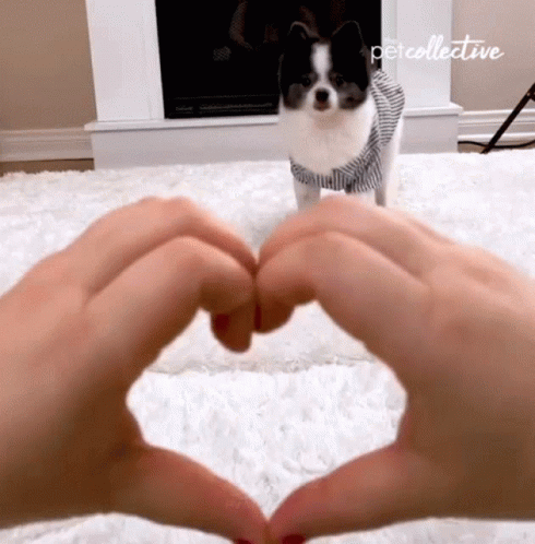 Paglalarawan ng Content: a person making a heart shape with their hands in front of a dog that is wearing a sweater that says petcollective