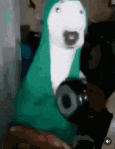Paglalarawan ng Content: a stuffed animal is wearing a green hoodie and holding a black object .