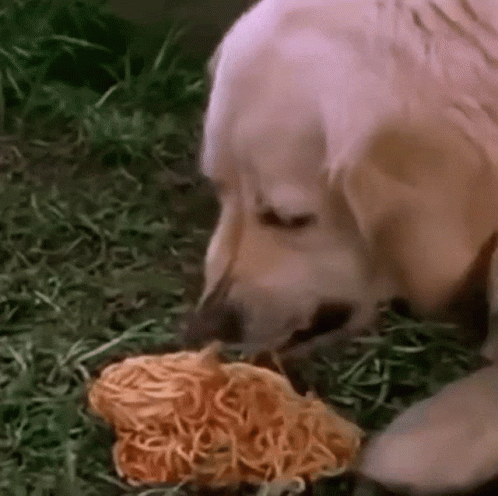 Paglalarawan ng Content: a dog is chewing on a pile of noodles in the grass