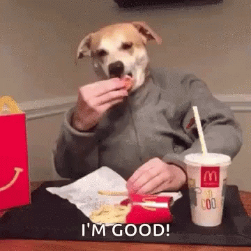 Paglalarawan ng Content: a dog with a human head is eating french fries and drinking a soda .