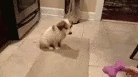 Paglalarawan ng Content: a small dog is standing on a tiled floor in a kitchen next to a trash can .