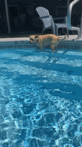 Paglalarawan ng Content: a dog is jumping into a swimming pool with chairs in the background