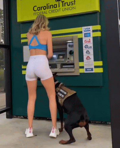 Paglalarawan ng Content: a woman standing next to an atm machine with a sign that says carolina trust federal credit union